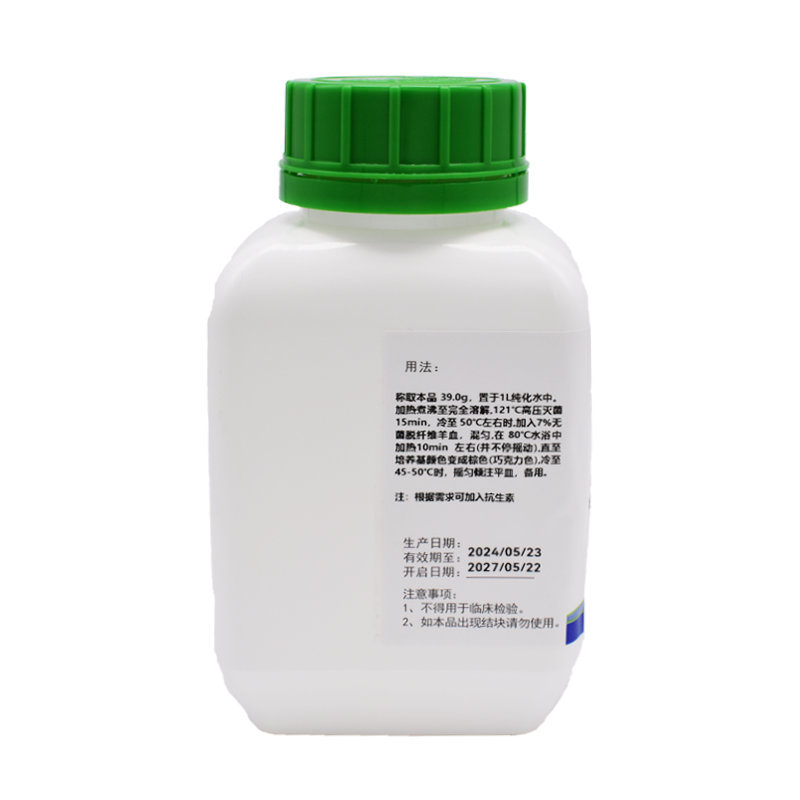 稱(chēng)取本品39.0g,置于1L純化水中。加熱煮沸至完全溶解,121℃高壓滅菌15min,冷至50℃左右時(shí),加入7%無(wú)菌脫纖維羊血,混勻,在80℃水浴中加熱10min左右(并不停搖動(dòng)),直至培養(yǎng)基顏色變成棕色(巧克力色),冷至45-50℃時(shí),搖勻傾注平皿,備用。