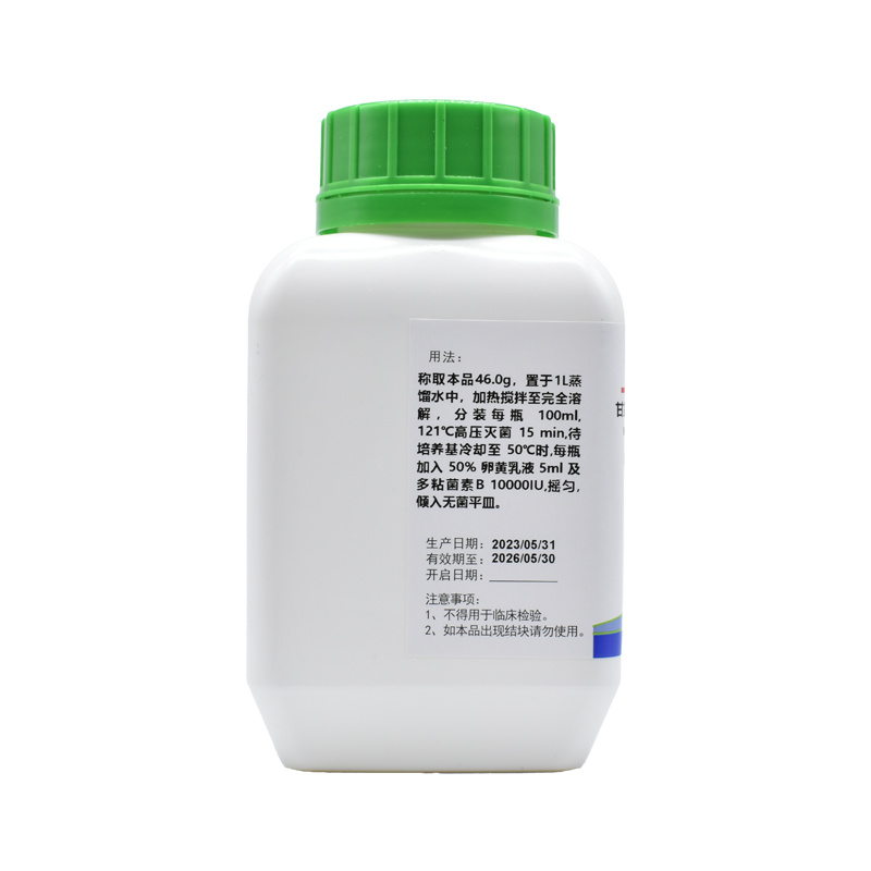 稱取本品46.0g,置于1L蒸餾水中,加熱攪拌至完全溶解,分裝每瓶 100ml, 121℃高壓滅菌 15 min,待培養(yǎng)基冷卻至 50℃時(shí),每瓶加入 50% 卵黃乳液 5ml 及多粘菌素B 10000IU,搖勻,傾入無菌平皿。